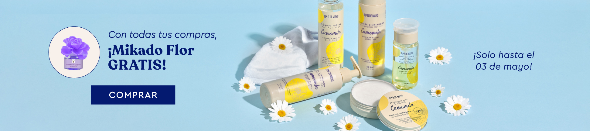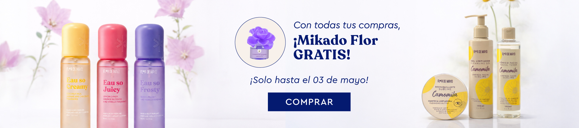 💜 En Flor de Mayo, cada día es una experiencia sensorial. Descubre nuestra cosmética low cost y perfumes irresistibles. Cuida tu piel con camomila, rosa mosqueta y argán. Refresca tus sentidos con brumas, relájate con sales de baño y bombas de baño, o lleva tu aroma favorito con nuestros mini perfumes premium. Sentirte bien es un placer diario.✨