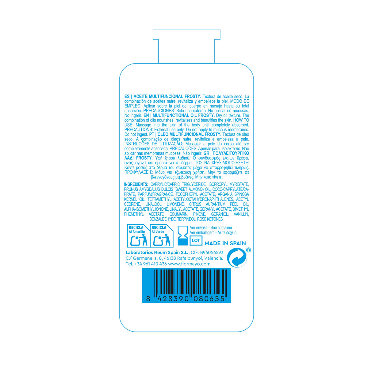 La fórmula de mind & body ha sido desarrollada en los laboratorios de Flor de Mayo por un equipo propio de formuladores que siempre busca resultados únicos y genuinos. Por ello, para desarrollar este aceite seco multifuncional frosty hemos empleado: